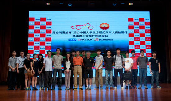 本网讯 5月16日下午,“昆仑润滑油杯”2013中国大学生方程式汽车大赛校园行之华南理工大学广州学院站在学生活动中心启动。学校党委书记袁文俊,汽车工程学院院长陈秉均、副院长尚启超,中国汽车工程学会副秘书长、大赛组委会秘书长闫建来,易车网首席知识专家、赛事总监陈刚,昆仑润滑油工程师陈刚,广州市领贤汽车维修有限责任公司技术部总经理、职业赛车手、赛车改装界资深工程师KKWONG和汽车工程学院一千多名师生一起参与了此次活动。