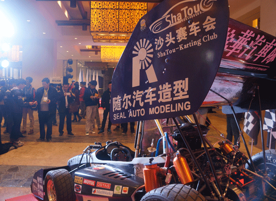 本网讯 11月20日,FSAE-华汽车队应邀携第三代赛车Ambition3(外号“小紫”)参加了中国最大的互联网车企易车公司在广州长隆国际会展中心举办的易车经销商年度峰会。参加峰会还有其余14支2014年“中国大学生方程式汽车大赛”(简称FSC)参赛车队,汽车改装行业的专业人士,及易车公司在全国各地的经销商。