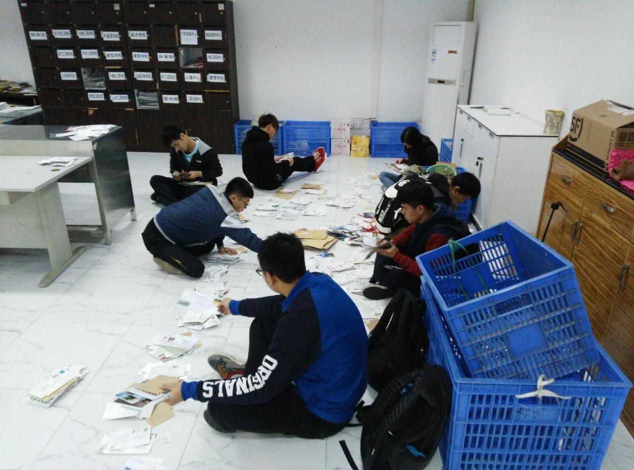 在这个过程中,由于书信较多,我们就分组合作,两三个人一组,一人分一人放,一人数,最后在我们的齐心协力下,终于完美地完成了分信的任务。最后将他们放到了宿舍楼下。做了这些公益活动,很累,但感觉很开心。真的很感谢有这次机会。