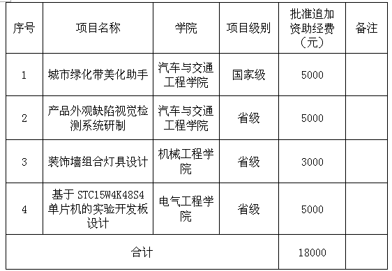 为了鼓励项目组科学严谨地开展研究,提高项目质量,打造一批有代表性的大创项目,学校将对部分建设质量较高、成果较丰富、资助经费确实不足的项目进行二次资助。经项目组申请、二级学院审查和校专家组评议,确定本次追加资助经费的情况如下: