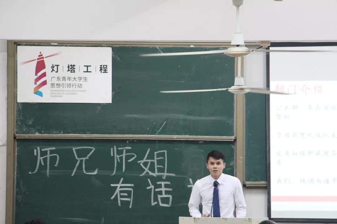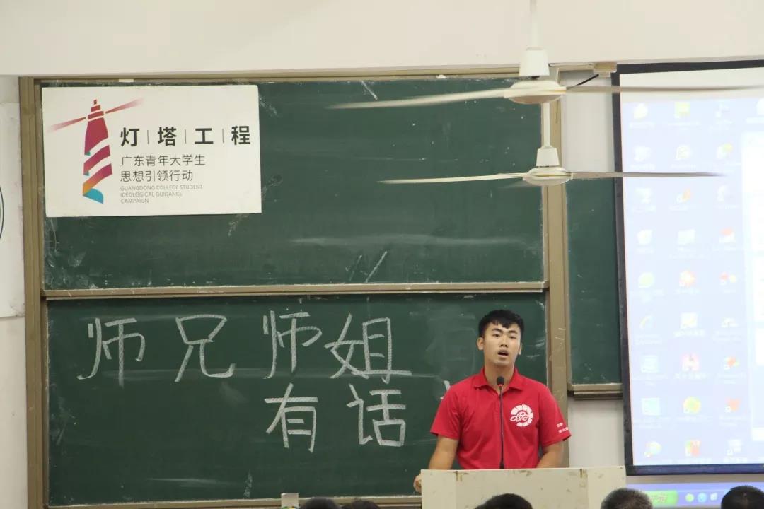 首先,是由16级杨祺彬师姐发言。师姐告诉师弟师妹们要尽快的适应大学生活,做到有规律的生活,合理安排好自己的时间。无论做什么事情都要做到不放弃,坚持下去。