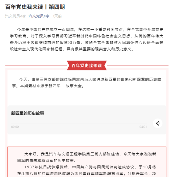 6月17日,学院推出“百年党史我来读”项目第4期,学院第三党支部预备党员陈佳怡同志诵读《新四军的故事》。