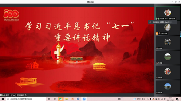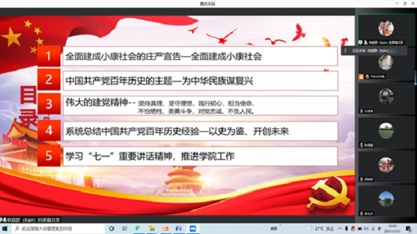 为深入学习贯彻习近平总书记在庆祝中国共产党成立100周年大会上的重要讲话精神,推进落实党史学习教育,按照学校党委统一部署和要求,7月27日,我院以线上会议的形式召开党组织理论学习中心组专题学习会,学院理论学习中心组全体成员、各支部书记参加会议,会议由学院党总支副书记纪书燕主持。
