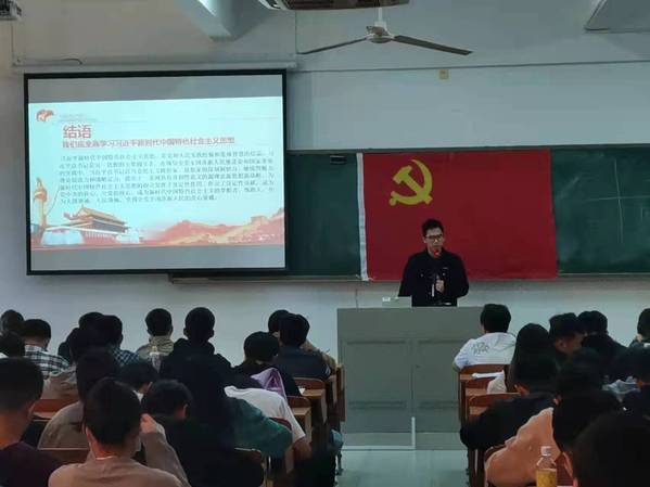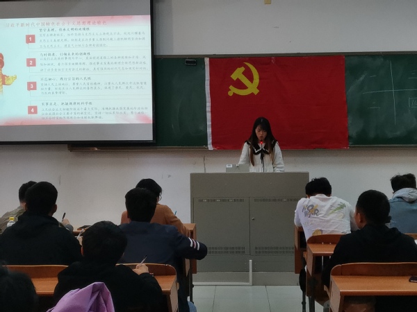 李良媛同志从习近平新时代中国特色社会主义思想理论特色和重大意义两个方面进行介绍,通过她精彩的演讲让我们明白中国特色社会主义思想,是符合我国当前国情,具有坚守真理、传承文明的延续性,与时俱进、引领未来的创新性,也有实事求是、把握规律的科学性,并通过李大钊曾说过的话:“黄金时代,不在我们背后,乃在我们面前;不在过去,乃在将来。” 让我们更有信心在习近平新时代中国特色社会主义思想的科学指引下,实现中华民族伟大复兴的目标。