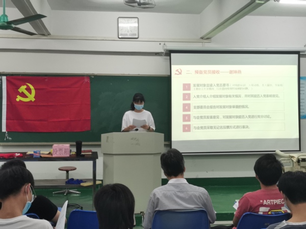 之后由入党介绍人代表朱智勇同志介绍谢坤燕同志的有关情况,并对其能否入党表明其意见。朱智勇副书记代表支部委员会报告对发展对象审查的情况,随后与会党员发表意见并进行充分讨论,最后无记名投票表决。本次大会应到党员九名(正式党员五名),实到党员八名(正式党员四名)。谢坤燕同志全票通过,同意发展为预备党员。