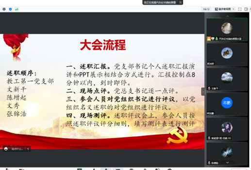 会上,纪书燕首先为大家介绍了述职会议的注意事项和考核评分表的填写要求等。随后,5位党支部书记从本年度主要工作、工作中存在的问题、认识体会和下一年优化改进的三个方面一一进行述职发言,充分展示了各党支部2022年度所做的一系列工作举措和支部书记抓党建工作的特色亮点。