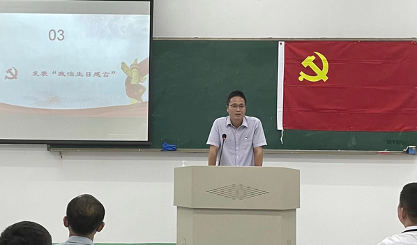 随后,新入党的学生党员胡逸飞、入党10年的教工党员黄晓婷和入党20年的教工党员柯志鹏作为代表依次上台发表政治生日感言。其中,柯志鹏同志表示,“自高中入党以来,我一直觉得党员的身份不仅是光荣,更是一份使命。在今后的工作与生活中,我将自觉接受党的教育、管理和监督,严以律己,勤奋务实,立足本职,扎实工作,不断提高自己的能力水平,更好地服务学生、服务学校、服务社会。”紧接着,在学院党龄最长的张继锋同志带领下,面对鲜红的党旗,新吸收入党的7名同志和参会其他党员庄严地举起右拳进行了入党宣誓和重温入党誓词仪式。
