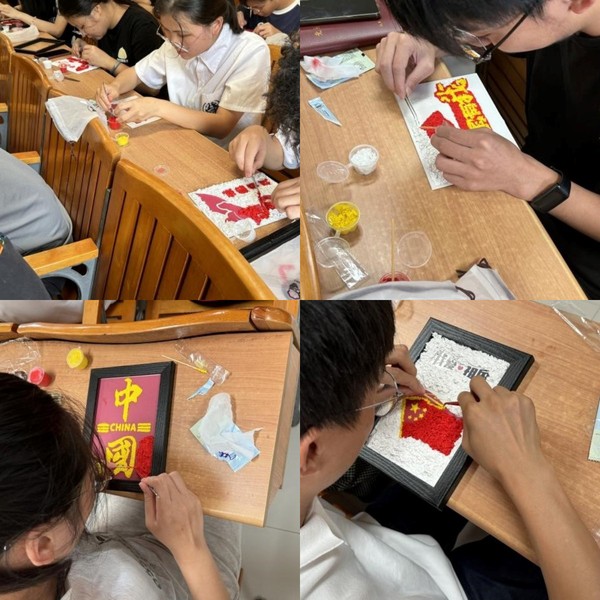 分享结束后,全体成员共同制作手工纸浆画,在勾勒好基本的纸板上用镊子夹取不同颜色的纸浆,耐心细致地叠铺,最终呈现出一幅幅肌理分明、色彩协调的纸浆画。绚丽的颜色、流畅的线条,描绘了祖国的美好祝愿,以纸浆画的形式,将爱国情怀定格于画纸上。国歌奏响,全体起立,同志们以饱满的热情、洪亮的声音唱出对祖国的热爱,乐止掌声雷动。