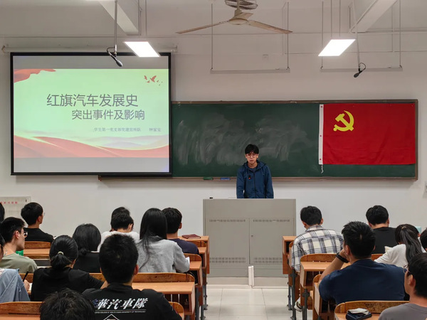 微讲坛第一项,首先由学生第一党支部教育管理队孙晨向大家讲述红旗汽车发展的历史。在新中国汽车工业初创的艰难时期,政治与经济环境复杂多变。面对国外技术封锁与市场挑战,建立一家能够代表中国工业实力的汽车品牌成为迫切需求。在这样的背景下,红旗汽车应运而生,它不仅是汽车工业的象征,更是我们祖国自强不息精神的体现。红旗汽车自诞生之日起,就肩负着打破技术封锁、实现自主创新的使命。面对外部压力和技术难题,红旗始终坚持自主研发的道路,不断攻克难关,提升产品性能与质量,展现了中国汽车人的智慧与勇气。