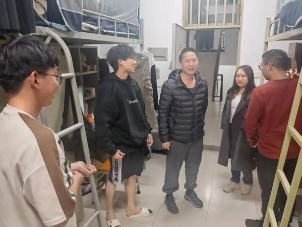 本网讯(记者 朱益博)为了进一步了解学生的返校情况和住宿情况,提醒学生注意开学各项事宜,交通安全和谨防诈骗,传递学院的关怀与温暖,2月23日晚,学院党总支书记林叙群,学工办主任纪书燕带领学院各年级辅导员和生活权益部的成员一行深入学生宿舍,开展走访活动。