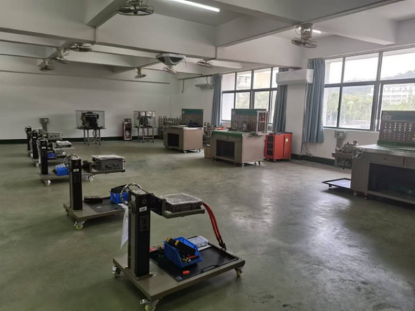 新能源汽车构造实验室,成立于2021年,实验室建筑面积约127平方米,实验设备固定资产近65万元。实验室主要配有纯电动汽车动力总成、高压三合一充配电总成、电机控制器、感应电机、同步电机、新能源汽车三电系统开发验证平台等设备8套及配套教学视频资源6套,汽车电器实物接线实验板10套。