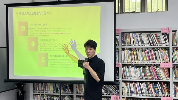 讲座还将汽车科技与物理、历史、思政跨学科联结,介绍汽车设计专家,中科院院士孟少农致力于汽车工业建设的案例,激励学生们刻苦学习、勇于创新。当播放比亚迪电动车助力全球减碳的动画时,学生肖弘毅坚定表示:“我也要成为攻克核心技术的工程师!”