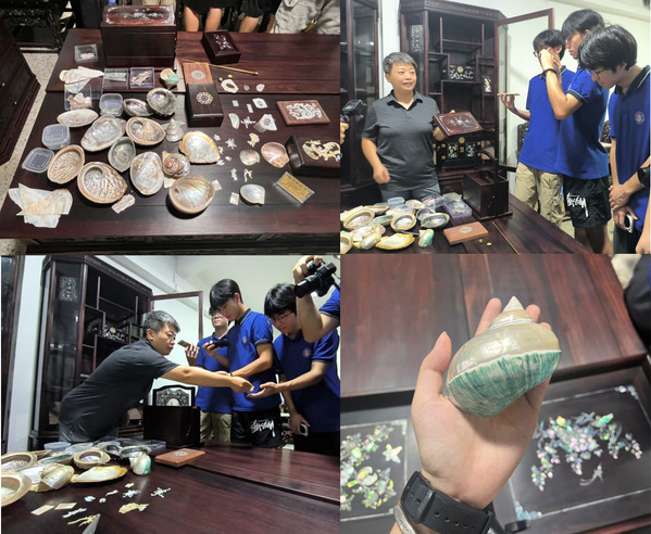 小队抵达工作室后,受到了红木螺钿技艺第五代传承人黄英英女士热情欢迎。在黄师傅的带领与讲解下,小队成员聚焦贝壳选材,认识到珍珠贝、夜光螺、黄碟贝、鲍鱼贝等各类贝壳在传统工艺中的奇妙运用。黄师傅向实践团介绍到:“广式螺钿里的红木与贝壳的搭配,叠贝的平面美、螺钿的立体韵,无一不考验着设计功力,唯有好设计,才能让红木与螺钿相得益彰,绽放独特光彩”。