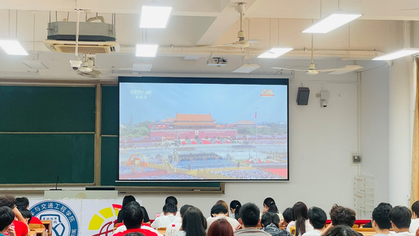 随后,全体师生共同观看了九三阅兵,邱冰妍同步为现场同学解读阅兵画面内容,现场氛围庄重而热烈。阅兵仪式展现出国家日益强大的国防实力和维护世界和平的坚定决心,极大地激发了同学们的家国情怀与使命担当。大家纷纷表示,将继续深入学习并付诸实践,为强国建设与民族复兴伟业贡献自己的智慧与力量。